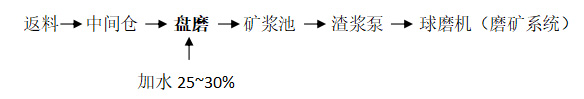該流程適用于有再磨工藝系統的球團廠(chǎng),作為預磨設備先將返料磨粉后便于管道輸送至磨礦系統。該流程產(chǎn)品細度有保障,可充分利用自有磨礦系統,生產(chǎn)環(huán)境好。