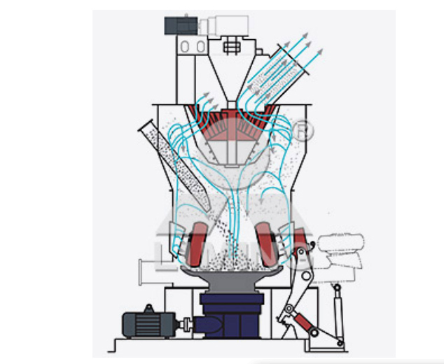 電動(dòng)機通過(guò)減速裝置帶動(dòng)磨盤(pán)轉動(dòng),同時(shí)熱風(fēng)從進(jìn)風(fēng)口進(jìn)入磨機內,物料從進(jìn)料口落在磨盤(pán)中央,磨輥在施壓裝置產(chǎn)生的粉磨力作用下碾壓置于磨盤(pán)上的物料。磨輥不繞地面垂直線(xiàn)公轉,但在物料阻力作用下繞自身的軸自轉,由于離心力的作用,物料向磨盤(pán)邊緣移動(dòng),經(jīng)過(guò)磨盤(pán)上的環(huán)形槽時(shí),受到磨輥的碾壓而粉碎,并繼續向磨盤(pán)邊緣移動(dòng),在磨盤(pán)邊緣的環(huán)形區域被自下向上的氣流帶至位于上部的分級裝置,經(jīng)過(guò)分離器時(shí),在導向葉片和轉子的作用下,粗料下落到磨盤(pán)上重磨,細粉隨氣流一起出磨機,在系統收塵裝置中收集,即為成品。物料在與氣體接觸過(guò)程中被烘干,達到所要求的產(chǎn)品水分。通過(guò)調節葉片的角度或分離器轉子轉速,便可得到不同細度的產(chǎn)品。